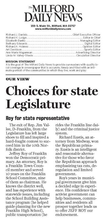 It was a great honor to receive the endorsement from the Milford Daily News today. Here is what the paper had to say: