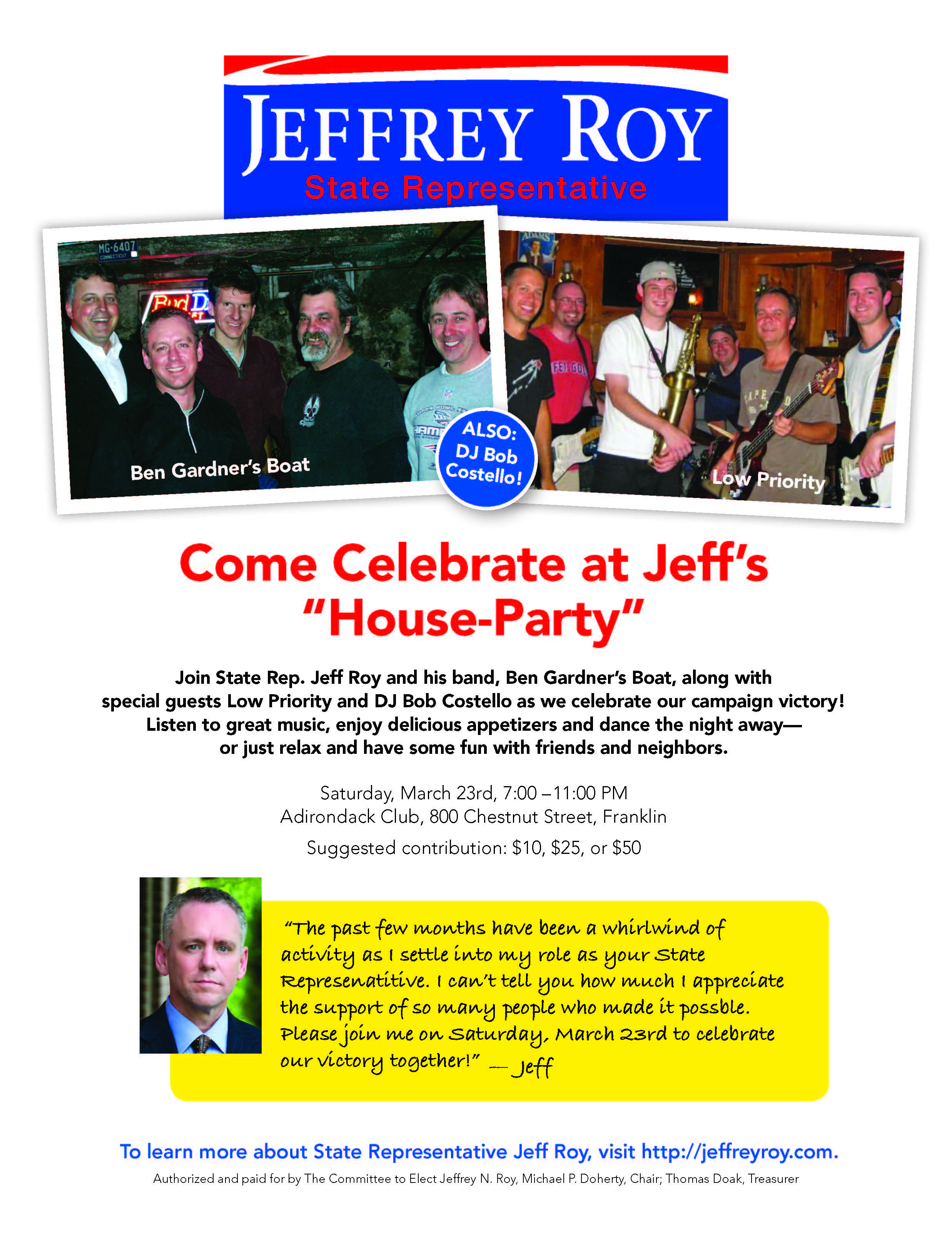 Join State Rep. Jeff Roy and his band, Ben Gardner’s Boat, along with special guests Low Priority and DJ Bob Costello as we celebrate our campaign victory! Listen to great music, enjoy delicious appetizers and dance the night away—or just relax and have some fun with friends and neighbors.